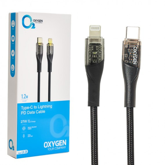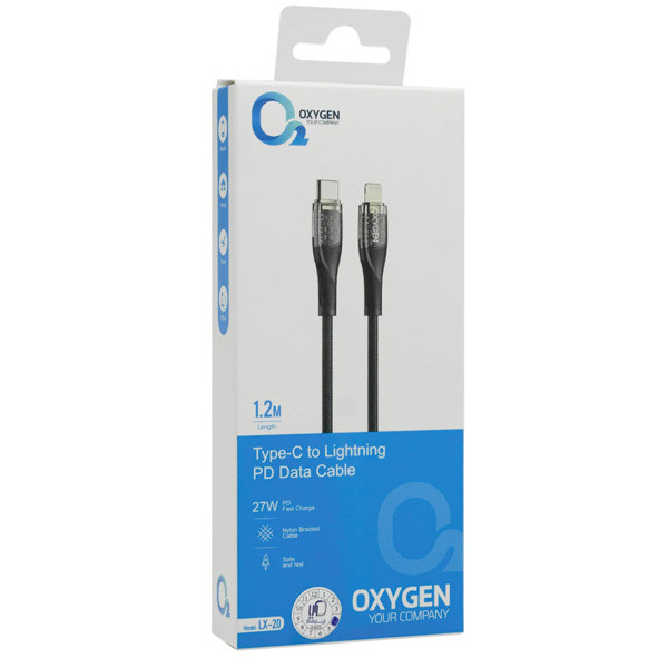 کابل شارژ تایپ سی به لایتنینگ اکسیژن مدل LX-20، یکی از لوازم جانبی ضروری برای کاربران آیفون است. جنس کابل پلاستیک ABS و روکش کنفی روی آن مقاومت بالایی دارد. طول این کابل 1.2 متر است. همچنین دارای قابلیت پشتیبانی از PD و 27 وات فست شارژ می باشد.